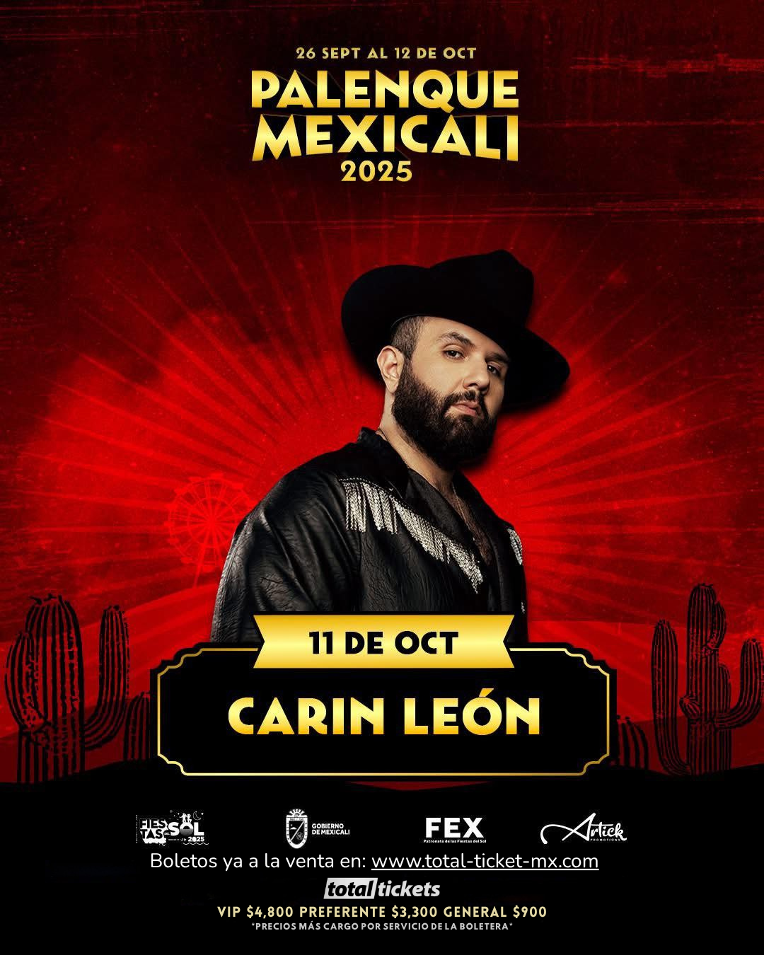 Carín León llega con toda su fuerza al Palenque Mexicali para brindarte una noche de puro regional mexicano con su estilo único. ¡Imperdible!